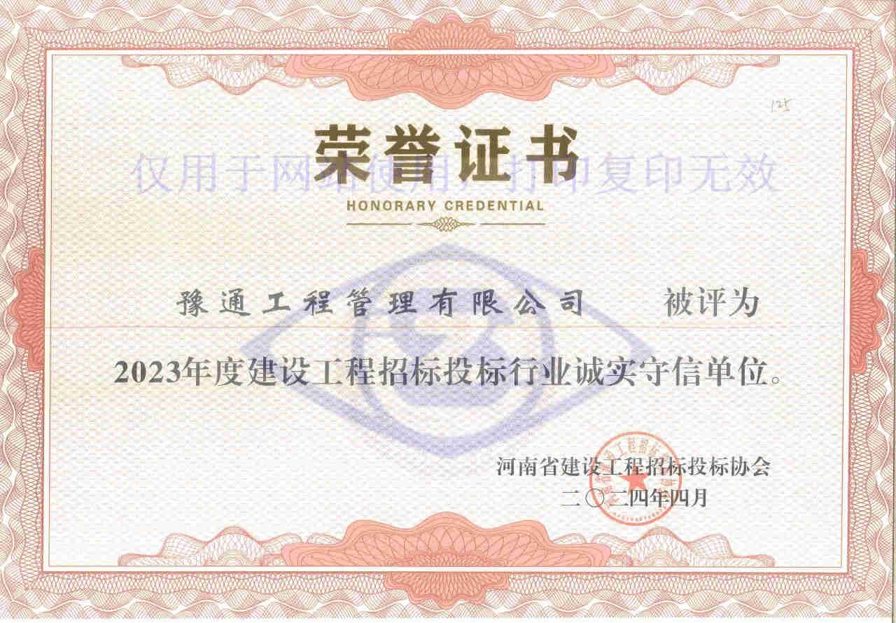 近日,河南省建設(shè)工程招標(biāo)投標(biāo)協(xié)會(huì)發(fā)布了《關(guān)于公布2023年度建設(shè)工程招標(biāo)投標(biāo)行業(yè)誠(chéng)實(shí)守信單位的通知》(豫建招協(xié)字〔2024〕11號(hào)),我公司榮獲“2023年度建設(shè)工程招標(biāo)投標(biāo)行業(yè)誠(chéng)實(shí)守信單位”榮譽(yù)稱(chēng)號(hào)。